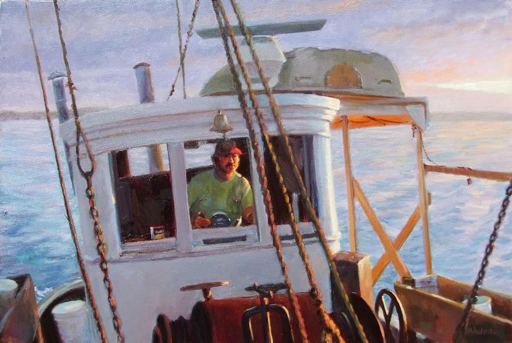 As a BFA candidate, I painted the figure for 4 years and continued the plein air work which I had started in high school. When I moved to Provincetown, MA in 1970, I became one of the few women fishermen unrelated to the boat owners’ families. Immeasurably moved by the often intuitive intelligence and dogged courage of my “Mates” I took many slides of the workings of the fishing industry on these wooden boats in the changing light upon the water. Always planning to paint from these slides, I continued my plein air practice, honing my skills so I could bring the spirit of working from life to the paintings I intended to paint from my slide references. The slide imagery included documenting the failed rescue of a beached boat and a burning wharf. But as I looked at the half dozen works I had completed, it became obvious to me that my true calling is the portraits of these fishermen at work, at rest, sometimes under stress. The five years I spent laboring on these antique boats significantly altered my philosophical and visual perspectives. I hope the emotional impact is present in my paintings for my viewers.